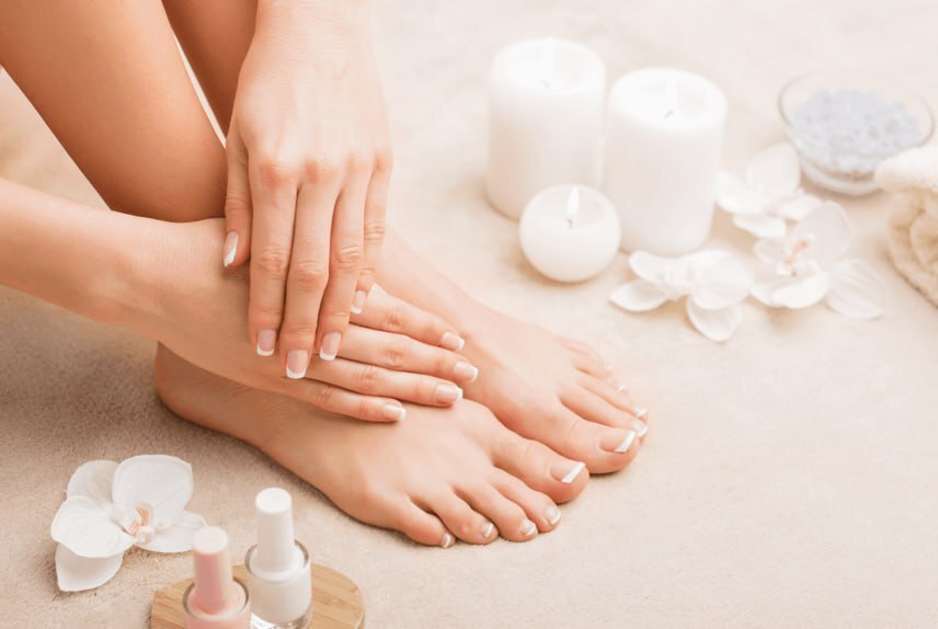 Уход за стопами и ногтями: обработка, придание формы и увлажнение без нанесения лака.